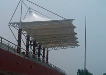 膜结构罩棚的跨度大是特点之一,在跨度大的建筑中需要对建筑的设计及膜材选用非常严格,由空气压力支撑膜面,或是利用柔性钢索或刚性骨架将膜面绷紧,从而形成具有一定刚度并能覆盖大跨度结构体系
